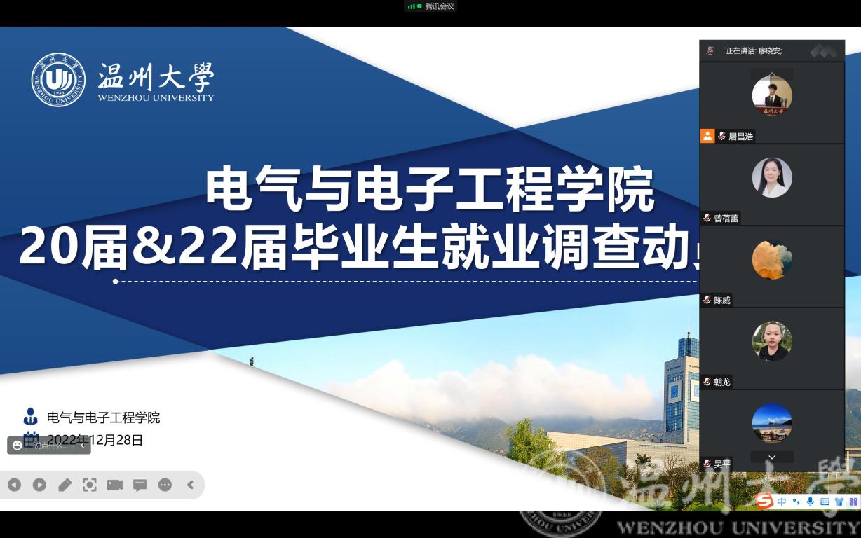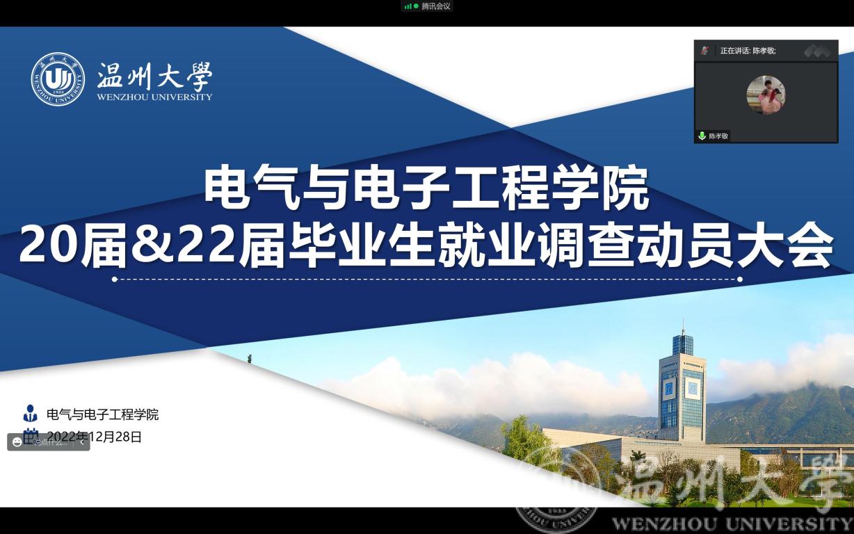 12月28日下午2:00,公司召开20届与22届毕业生就业调查动员大会线上会议。副经理陈孝敬、党委副书记曾蓓蕾、电气系主任吴平、电子系主任庄友谊、学工办主任廖晓安以及20届与22届各毕业班班主任参会,会议由学工办就业辅导员屠昌浩主持。