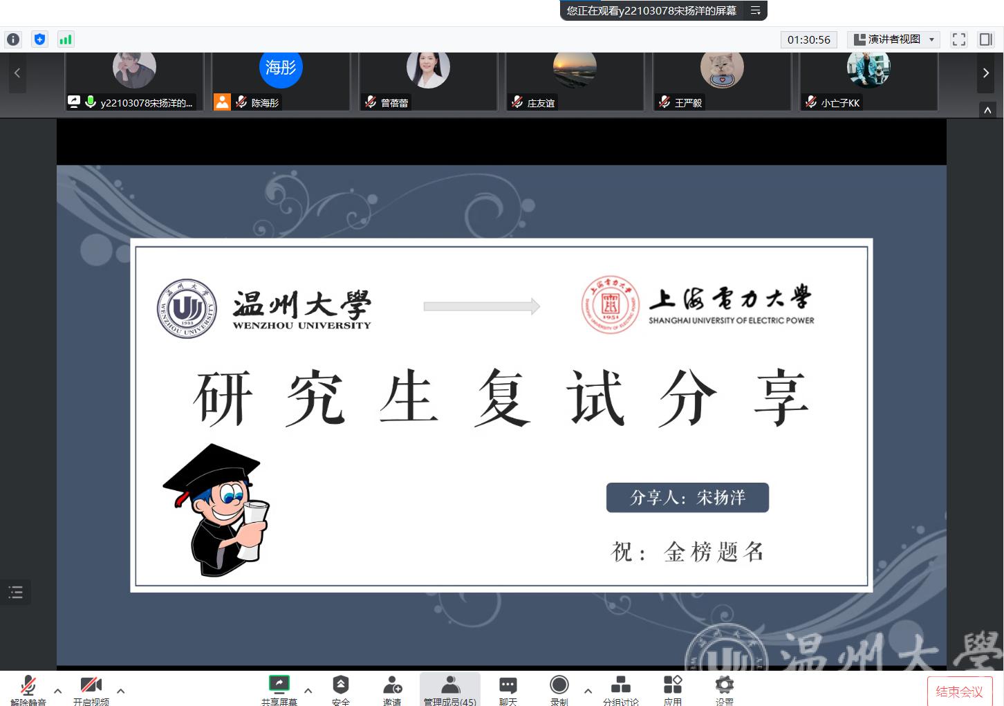 随后,2022届毕业生袁舸凡、宋扬洋和2021届毕业生林怀周三名优秀员工以自身复试经历为例,和学弟学妹们分享了自己复试和调剂的经验。考取浙江大学的袁舸凡同学分享了自己当时的复试流程以及专业课问答的要点;上海电力大学的宋扬洋同学就上电的复试内容和形式进行介绍,提醒学弟学妹们及时联系导师。桂林电子科技大学的林怀周同学讲述了自己读研期间的感悟,在联系导师、把握调剂机会等方面给出了相关建议。