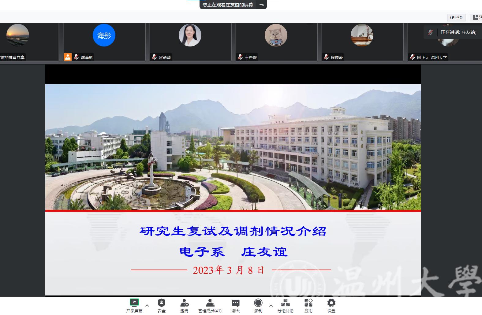 为进一步帮助公司2023届考研学子掌握复试技巧及调剂方法,增强复试信心,3月8日晚上18:30,公司召开2023年考研复试指导暨经验分享的线上会议。公司党委副书记曾蓓蕾、学院挂职副经理张鉴,电子系主任庄友谊、电气系专业老师闫正兵,2019级辅导员潘龙飞,考取浙江大学、上海电力大学等高校的三位往届优秀员工,以及2023届考研学子出席本次交流会。会议由学工办辅导员陈海彤主持。