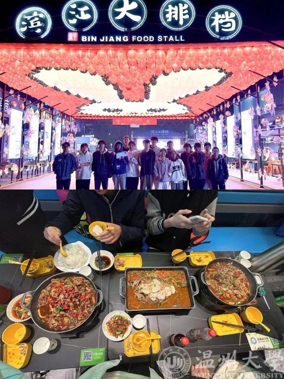 来到滨江大排档,同学们在小街上游逛,这里美食以海鲜居多,但也不乏许多烧烤美味。店面的设计极具特色,总体布局呈现了半包围的结构,两个侧边又连成一片,最为夺人眼球的便是那一个个似蒙古包的包间,设置在室外,体验一次半露天的烧烤,也是别有一番风味。不愧是发展在瓯江的美食街,自然以各色海鲜为主菜,放眼望去,烤鱼、蒸鱼、酸菜鱼应有尽有,生蚝、龙虾也给出了许多浙菜的式样,让人大饱眼福。