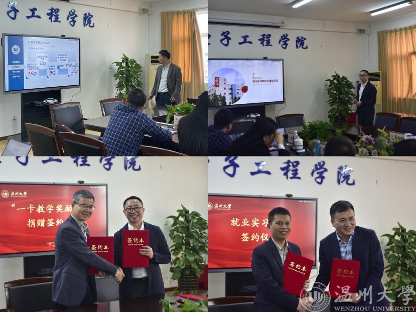 4月13日下午,温州一卡锁具科技有限公司总经理项文广、副总经理李乾兴一行来公司交流并设立“一卡教学奖励基金”。公司经理汪鹏君、党委书记李方强、副经理陈孝敬、党委副书记曾蓓蕾、智能锁具研究院经理阮秀凯以及电气、电子系主任、支部书记与各科室负责人出席了签约仪式。
