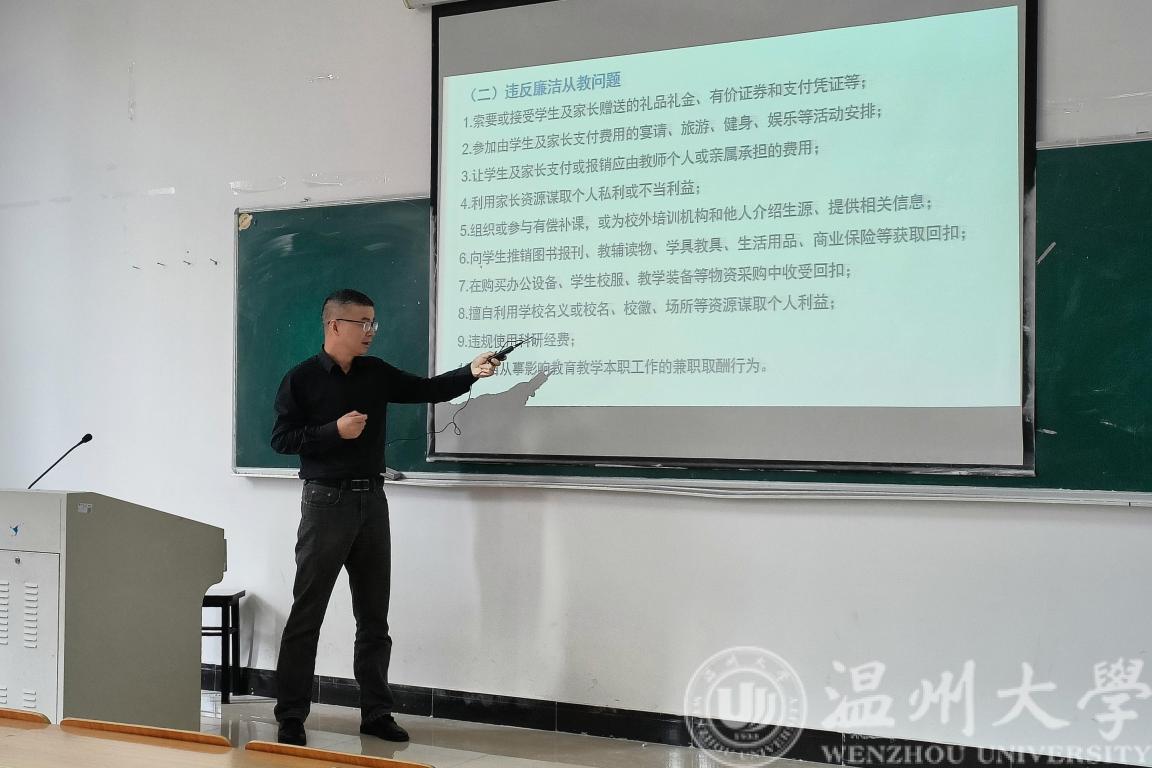 会上,党委书记李方强传达了《浙江省教育厅办公室关于印发<全省教育系统师德师风问题整治工作实施方案>》以及《球盟会官网师德师风问题专项整治工作实施方案》的通知精神,他指出,员工安全和师德师风是学院建设事业的“1”,其余都是“1”后面的“0”。如果没有这个“1”,再多的“0”都会变得毫无意义。因此,切实加强师德师风建设是学院建设的首要任务。