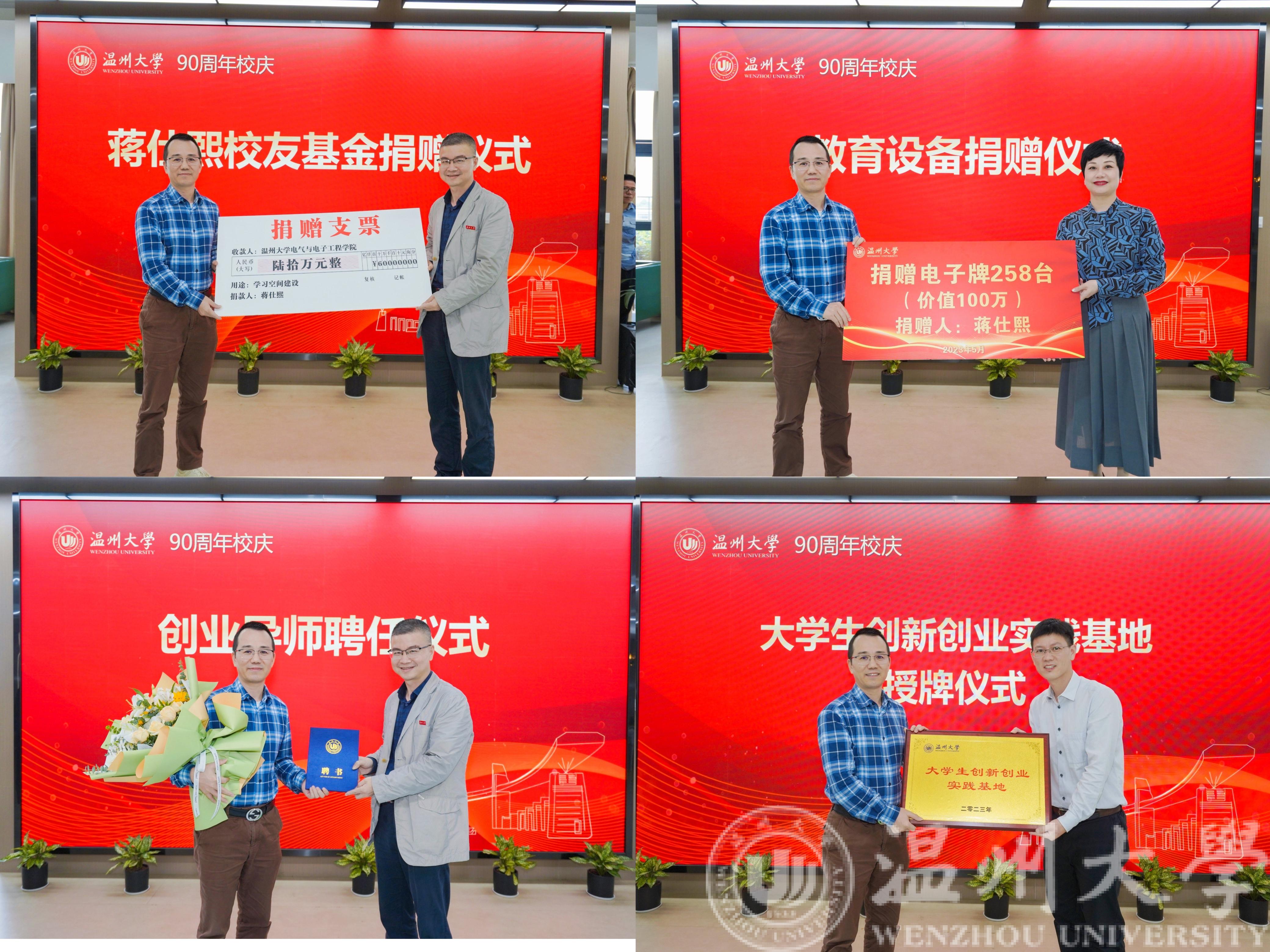 在现场各位嘉宾的共同见证下,蒋仕熙员工与李方强书记和张若妤处长进行了隆重的基金捐赠与教育设备捐赠仪式。与此同时,公司还聘请蒋仕熙员工担任公司创业导师,并授予蒋仕熙员工的企业为公司老员工创新创业实践基地。