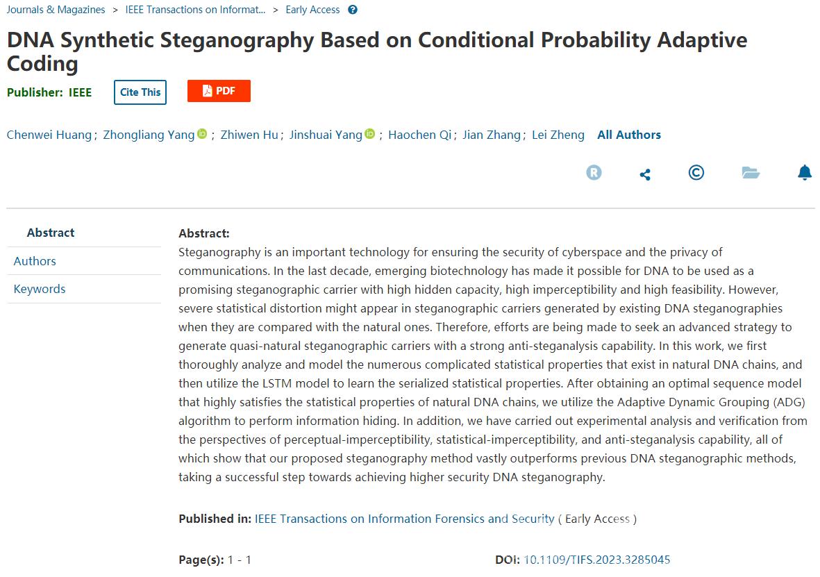 针对目前DNA隐写术的统计失真问题,球盟会张鉴教授课题组与北京邮电大学、合肥工业大学等团队深度合作,提出了一种基于序列建模及条件概率自适应编码的序列生成式DNA隐写术,利用循环神经网络与长短期记忆神经元模型建模并学习原始天然DNA载体中的统计分布特征。获得高保真序列模型后,通过自适应动态分组算法生成与天然DNA载体高度相似的隐写载体。重复的抗隐写分析实验表明所生成的DNA隐写载体显著提升了抗隐写分析能力,可有效抵抗来自最先进神经网络隐写分析术的侦测。同时,课题组还针对统计-不可感知性提出了两种全新的评价方法,建立了DNA隐写中不可感知性的统一评价体系。