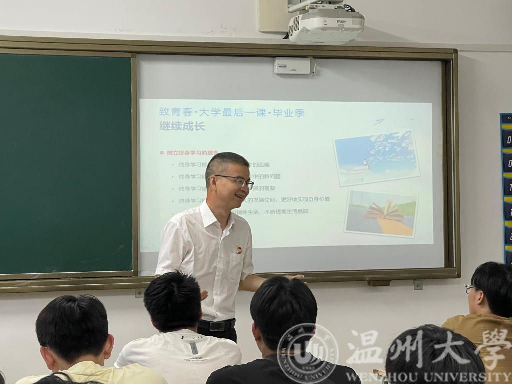 2023年6月19日下午3:30,在2023届毕业生即将告别温大校园之际,公司领导班子集体下班级,同毕业班班主任一道为毕业生上好最后一堂课。为做好本次毕业生教育,学院前期认真策划,精心组织,领导们围绕“立足当下,肩负青年时代使命”、“继续成长,树立终生学习意识”、“心怀感恩,培养优秀人格品质”、“展望未来,求学问是敢为人先”四个主题,分赴各个毕业班级,给毕业生们带去了尊尊嘱咐,勉励毕业生们,要听党话跟党走,勇于担当历史使命;要把劳意识形态关,坚持马克思主义信仰;要勤磨砺恒自律,提高能力本领;要懂感恩爱生活,成就精彩人生;要牢记温大员工身份,不忘校训院训,传承温大精神,在新的征程中继续发光发热,绽放最的青春。