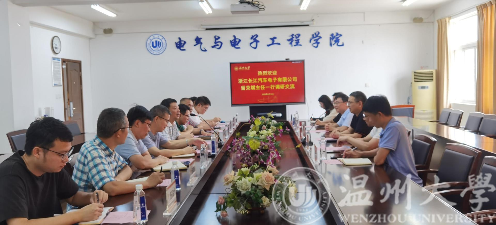 会上,汪鹏君经理首先对留客斌主任一行的到来表示诚挚的欢迎,就学院的团队队伍、科研情况、人才培养、服务地方等方面介绍了学院发展情况。浙江长江汽车电子有限公司留客斌主任介绍了企业的经营内容以及企业急需攻克的技术难点。