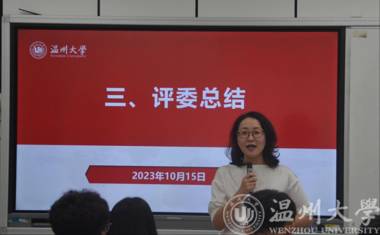 所有选手展示完毕后,朱丽莉老师作为评委代表总结发言。她赞扬了公司大一新生踊跃参赛的热情,并建议同学们不要拘泥于模板,既要仰望星空,又要脚踏实地:首先,同学们的职业规划要能结合经济社会发展的需要,要有情怀;其次,同学们对目标职业要有充分的了解;最后,职业规划大赛作为一项比赛,同学们要注重一些外在的要素,例如着装、PPT等。