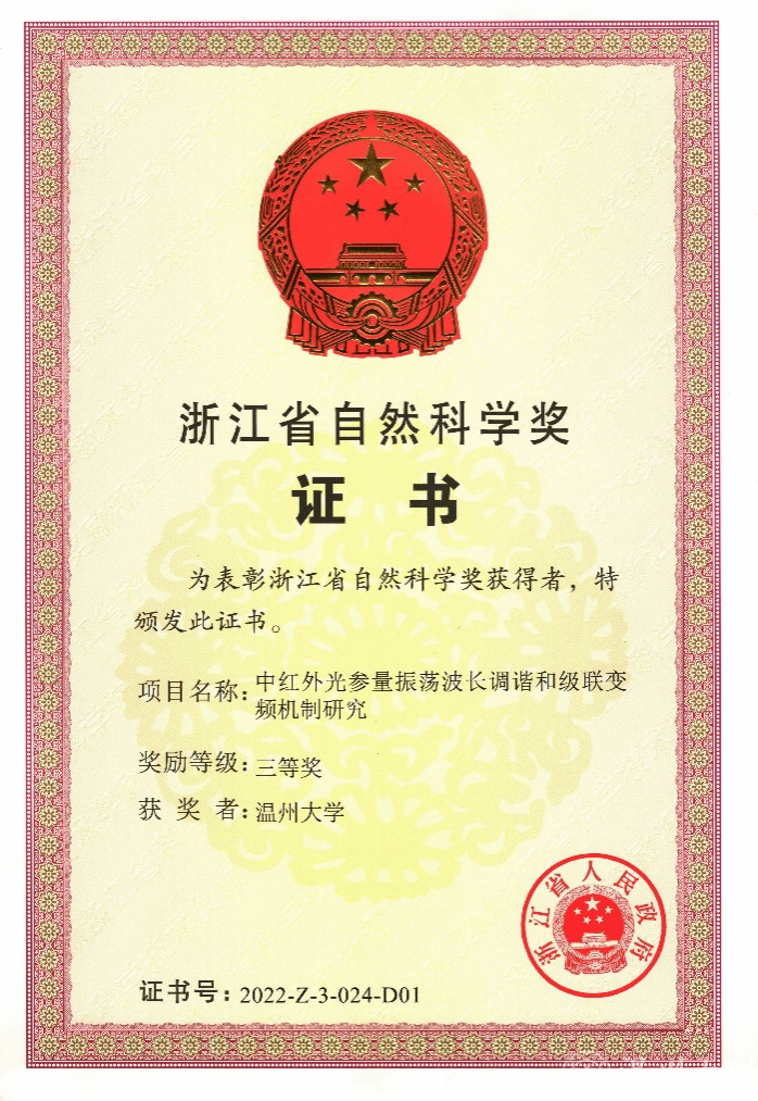 日前,浙江省人民政府发文公布2022年度浙江省科学技术奖获奖名单。公司朱海永教授主持完成的“中红外光参量振荡波长调谐和级联变频机制研究”成果获浙江省自然科学奖三等奖。