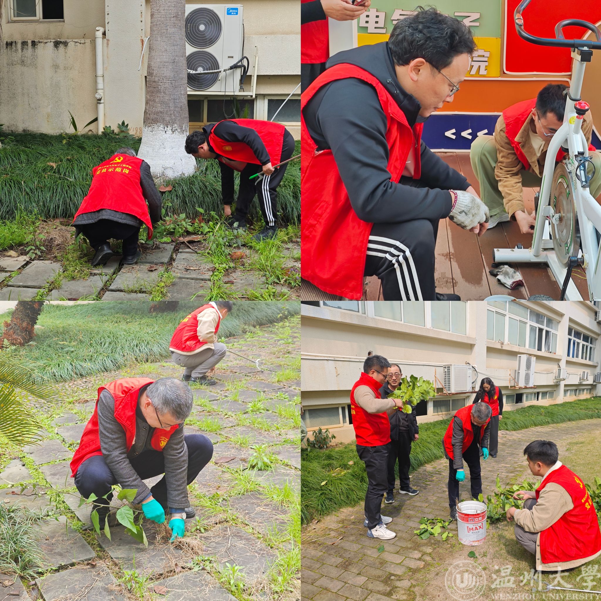 雷锋同志说‘我是人民的勤务员’。作为高校教师,‘勤务’就是体现在为员工服务中,为员工收拾一片“净土”作为本次电气电子学院行政教工党支部学习雷锋的主题。各位党员在学院领导的带领下,积极投身于志愿活动,清理学院大门和学院AB幢之间的休闲区域。
