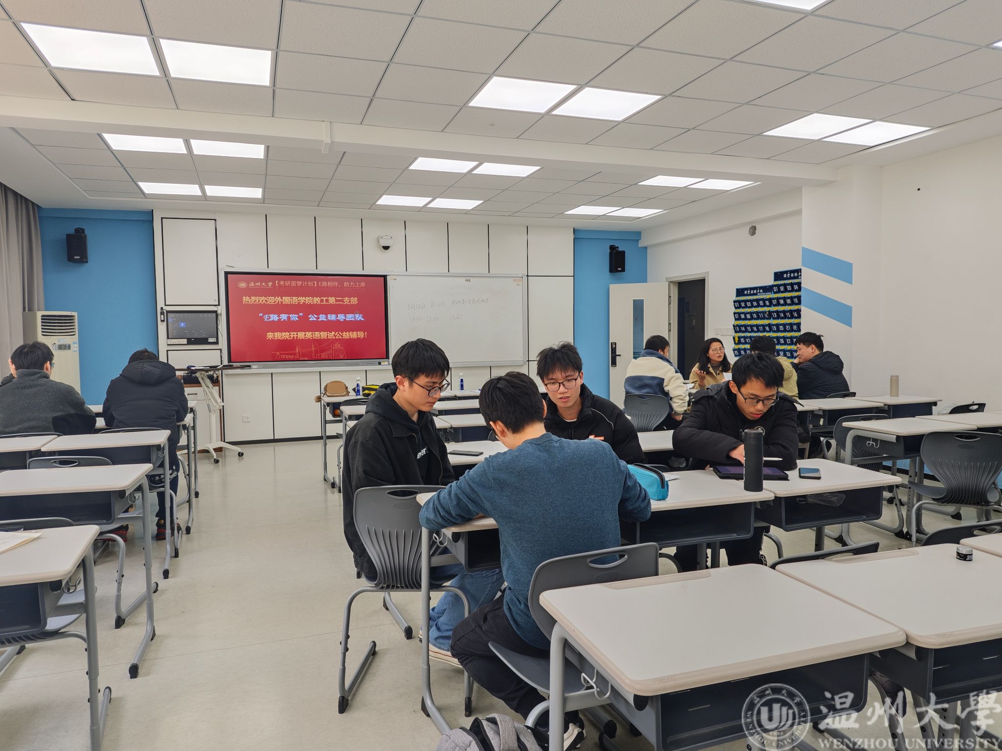 公司一直高度重视员工的考研准备工作,通过举办各类考研辅导、复试经验分享活动,为员工提供全方位的支持。近年来,外国语学院教工第二党支部的“E路有你”公益辅导团队一直致力于指导公司学子考研英语复试,帮助他们顺利圆梦。去年,公司有十余名员工参与该团队王素娟老师两次英语复试的线上指导,助力十余位同学顺利上岸;3月13日下午,“E路有你”公益辅导团队叶小芳、苏玉洁、冯小芳和陈博栋四位老师,莅临公司为同学们提供线下考研英语复试指导。他们的有力指导让同学们对接下来的英语复试环节充满信心。