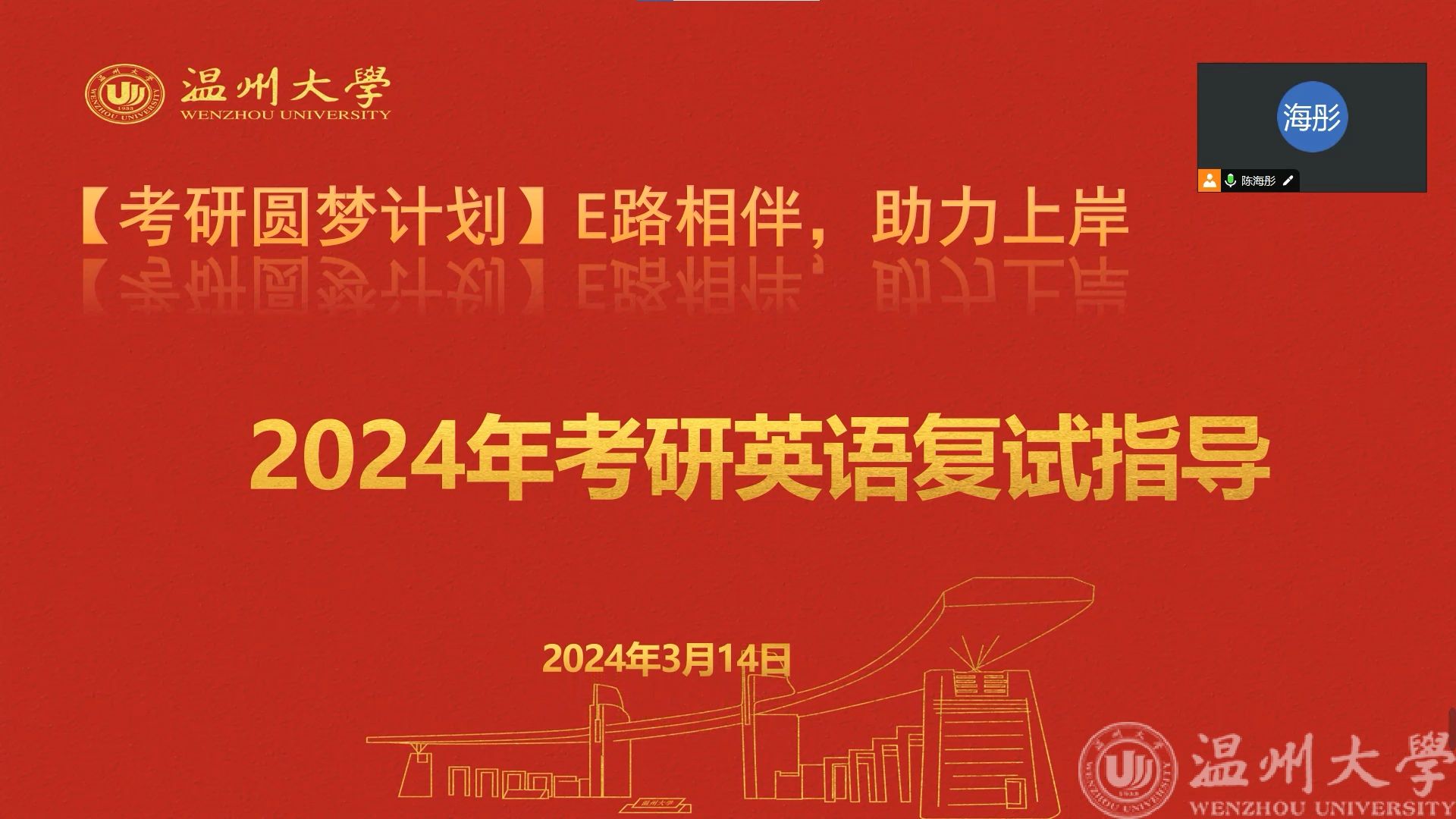 为帮助2024年考研学子轻松应对复试中英语面试环节,助力学子顺利上岸,3月14日晚上19:30公司在线上开展2024年考研复试英语面试培训活动。在外国语学院“E路有你”教工第二党支部书记王素娟老师的精心组织与安排下,辅导团队的王廷达、张娟两位老师通过线上视频会议的形式,为同学们提供了一对一的模拟面试辅导。