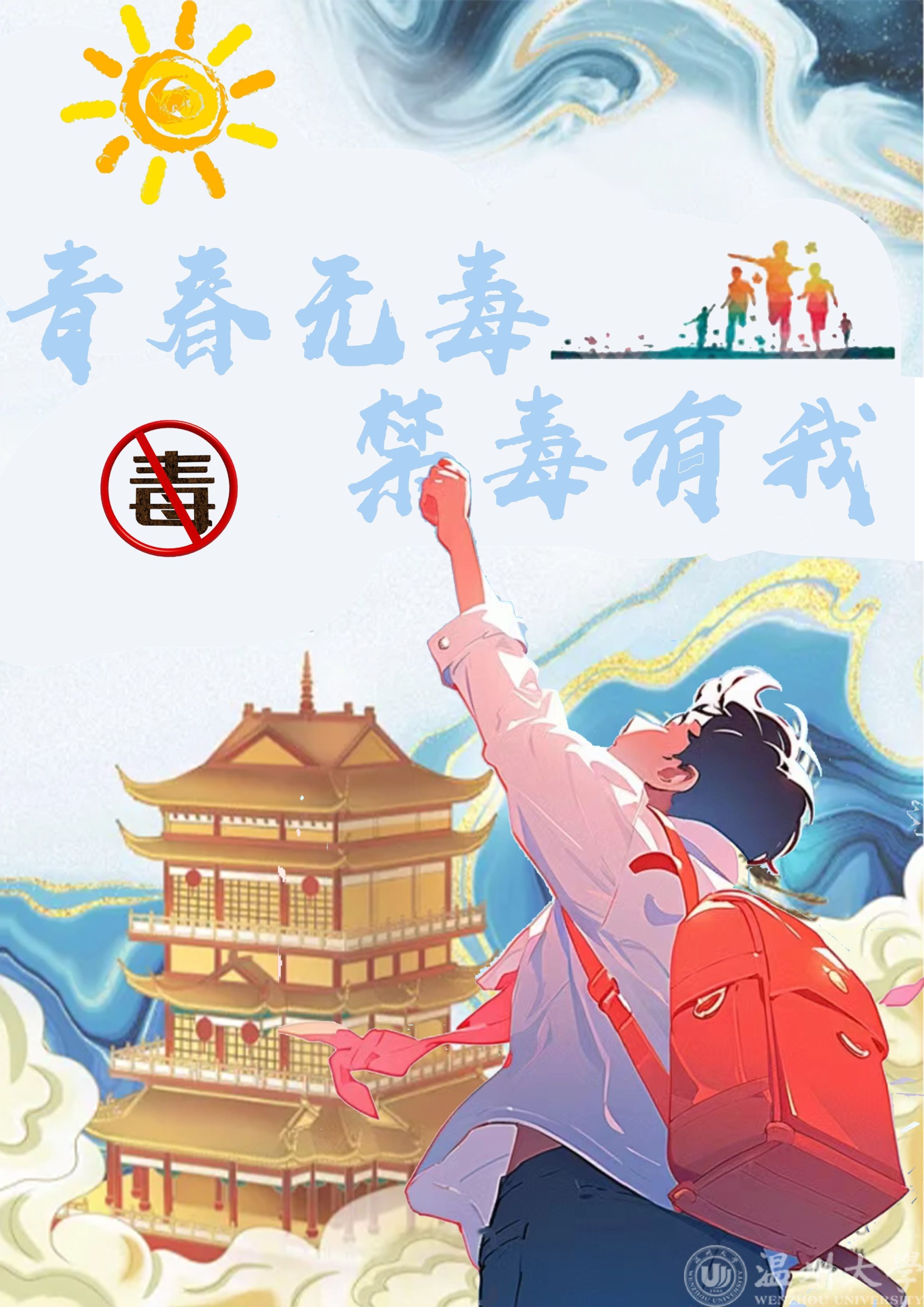 (青春无毒,阳光逐梦——22电科1班周羿成。此海报以青春阳光为主要元素,画面正中为一位青春活力的少年,伸长了双手去逐日逐梦的画面,寓意了老员工群体应当怀揣梦想,一心向阳,向未来进发,扫除道路上的邪恶诱惑)