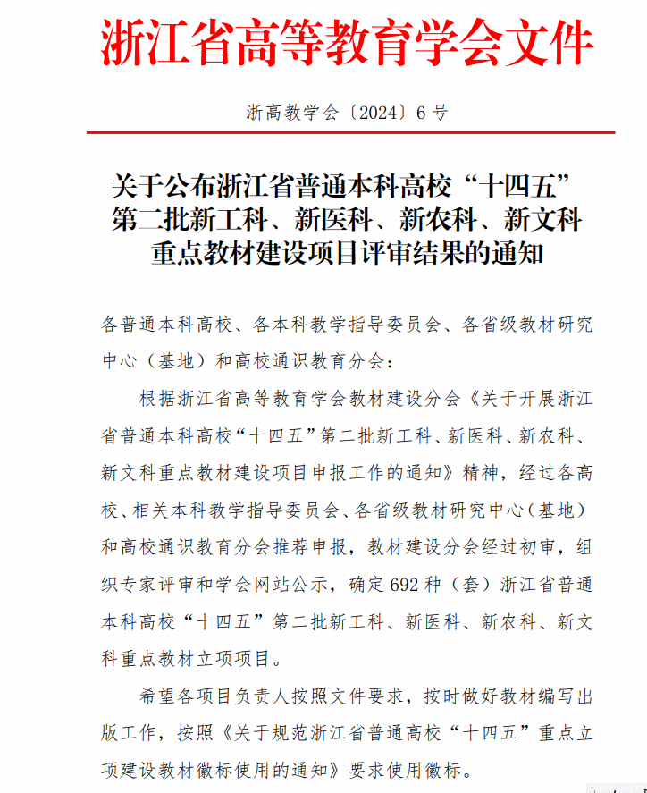 日前,根据浙江省高等教育学会教材建设分会公布的《关于确定浙江省普通本科高校"十四五"第二批新工科、新医科、新农科、新文科重点教材建设立项项目的公示》公司庄友谊、李靖老师编写的教材成功入选。