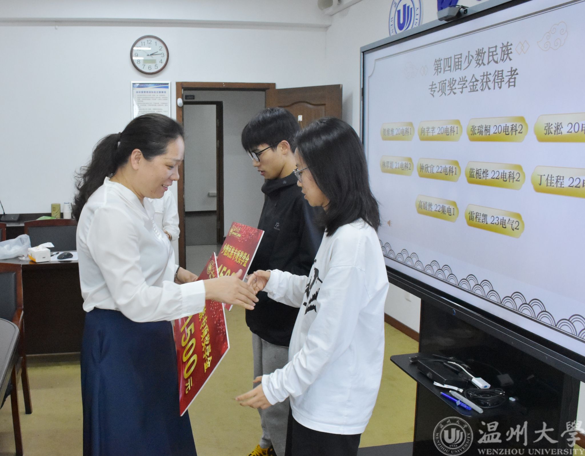 会议伊始,陈海彤老师向在座同学介绍了少数民族专项奖助学金的设立及评奖情况。随后曾蓓蕾书记为获得第四届少数民族员工专项奖学金的10位同学颁奖以及临时困难补助的2位同学颁奖,廖晓安老师为获得少数民族员工专项助学金的10位同学颁奖。