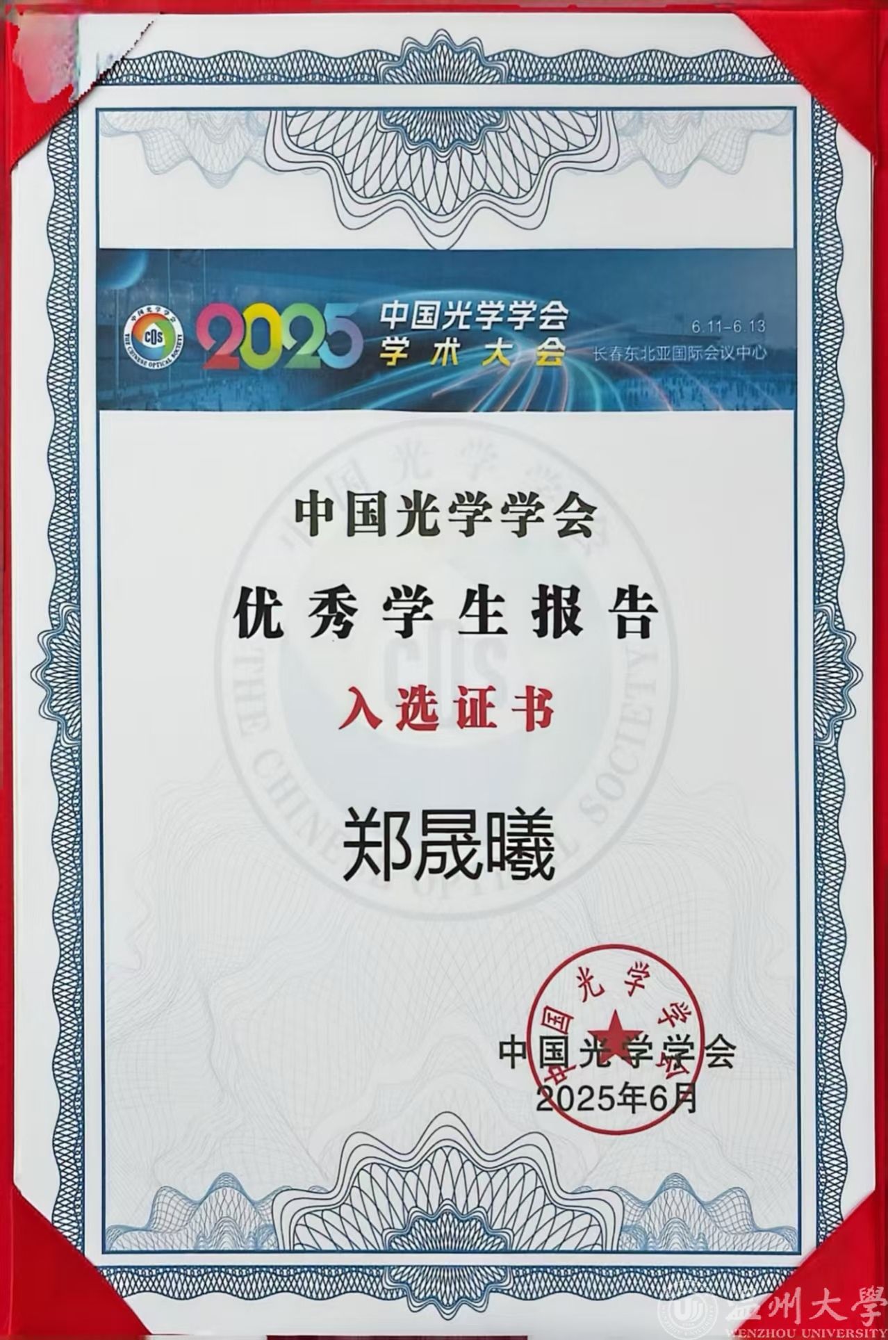 6月11-13日,2025年中国光学学会学术大会在长春东北亚国际会议中心召开。公司温州市微纳光电重点实验室/浙江省光电功能器件与数字化检测国际合作基地师生参会并在“激光物理技术与应用”专题作学术报告。会议评选了50个中国光学学会“优秀员工报告”,公司郑晟曦和李松涛等员工的张贴报告《全固态级联拉曼单腔多色激光技术及器件集成》获评中国光学学会“优秀员工报告”,“激光物理技术与应用”专题仅3个(包括口头报告和张贴报告)入选。12日下午在长春东北亚国际博览中心举行了优秀员工报告的颁奖仪式,学会秘书长刘旭教授为获奖者颁奖。