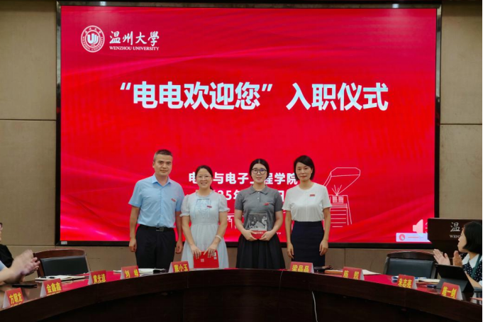 会议伊始,学院负责人为两位新入职教职工举行了温馨的“电电欢迎您”入职仪式。公司党委书记、副经理分别为新教师赠送校徽和书籍。