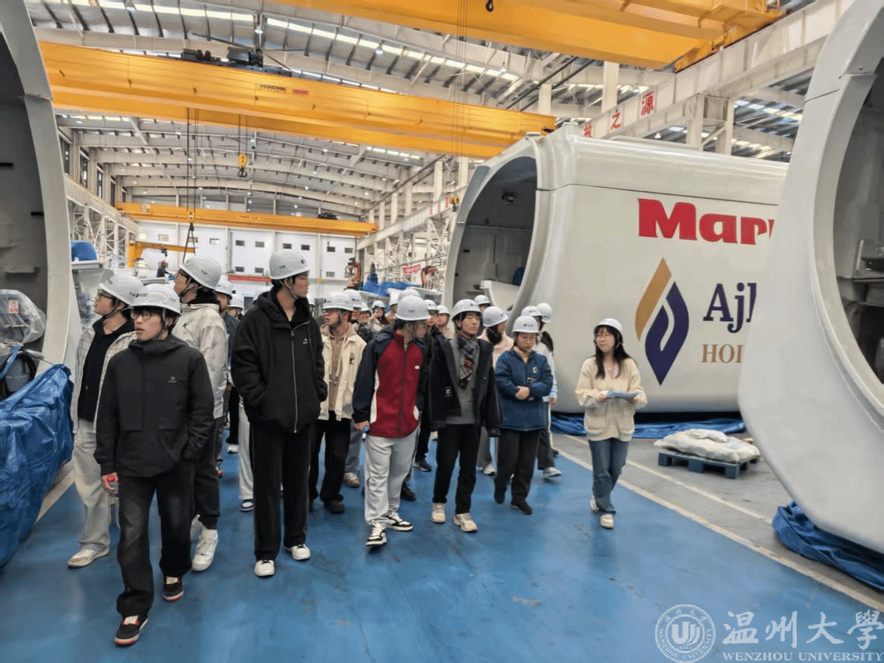 21日8:40同学们乘车前往第二家见习企业——运达能源科技。9:30起,大家深入风电装备研发车间与技术展厅,沉浸式了解风电产业的核心技术与绿色能源发展趋势,企业技术人员和温大员工王图南的专业讲解让同学们对新能源领域的就业前景有了更清晰的认知。