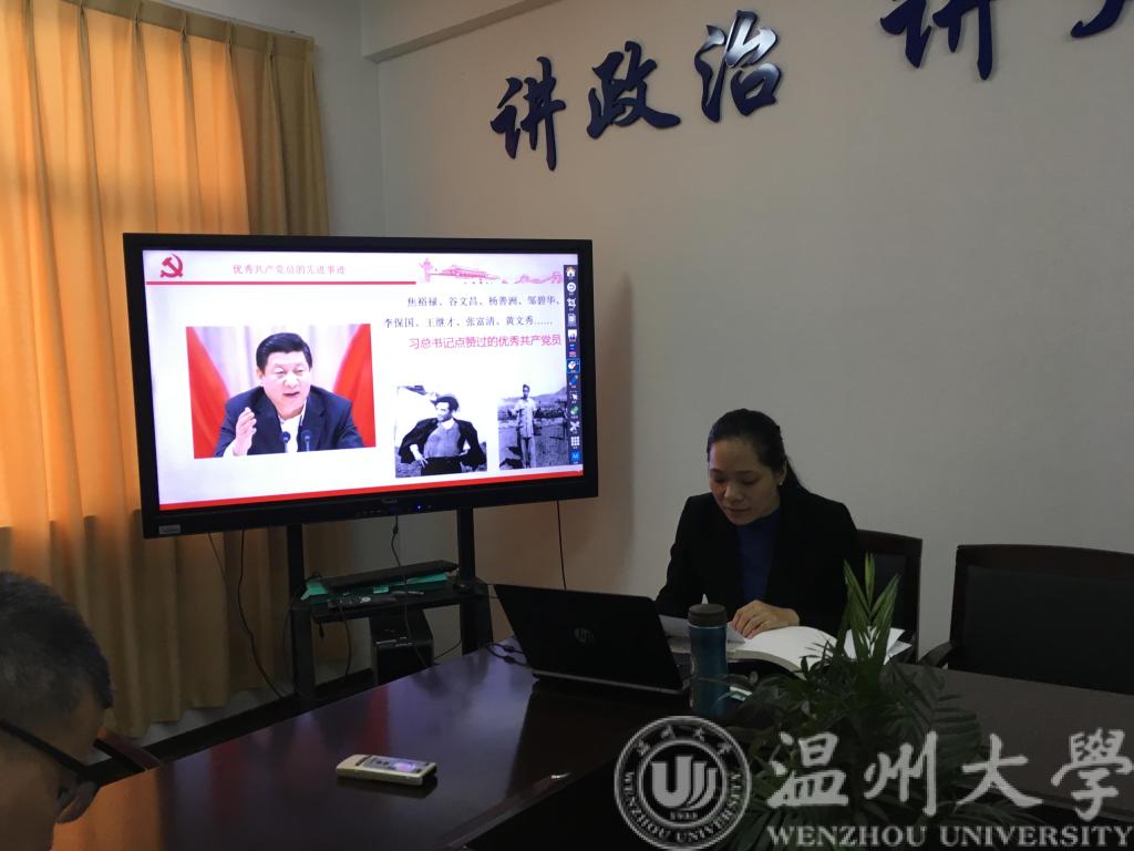 10月30日下午,球盟会行政教工党支部“不忘初心、牢记使命”集中学习会在学院1A504会议室召开,支部书记曾蓓蕾为支部党员作题为《党员的担当精神》主题教育专题党课。