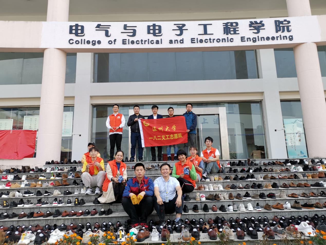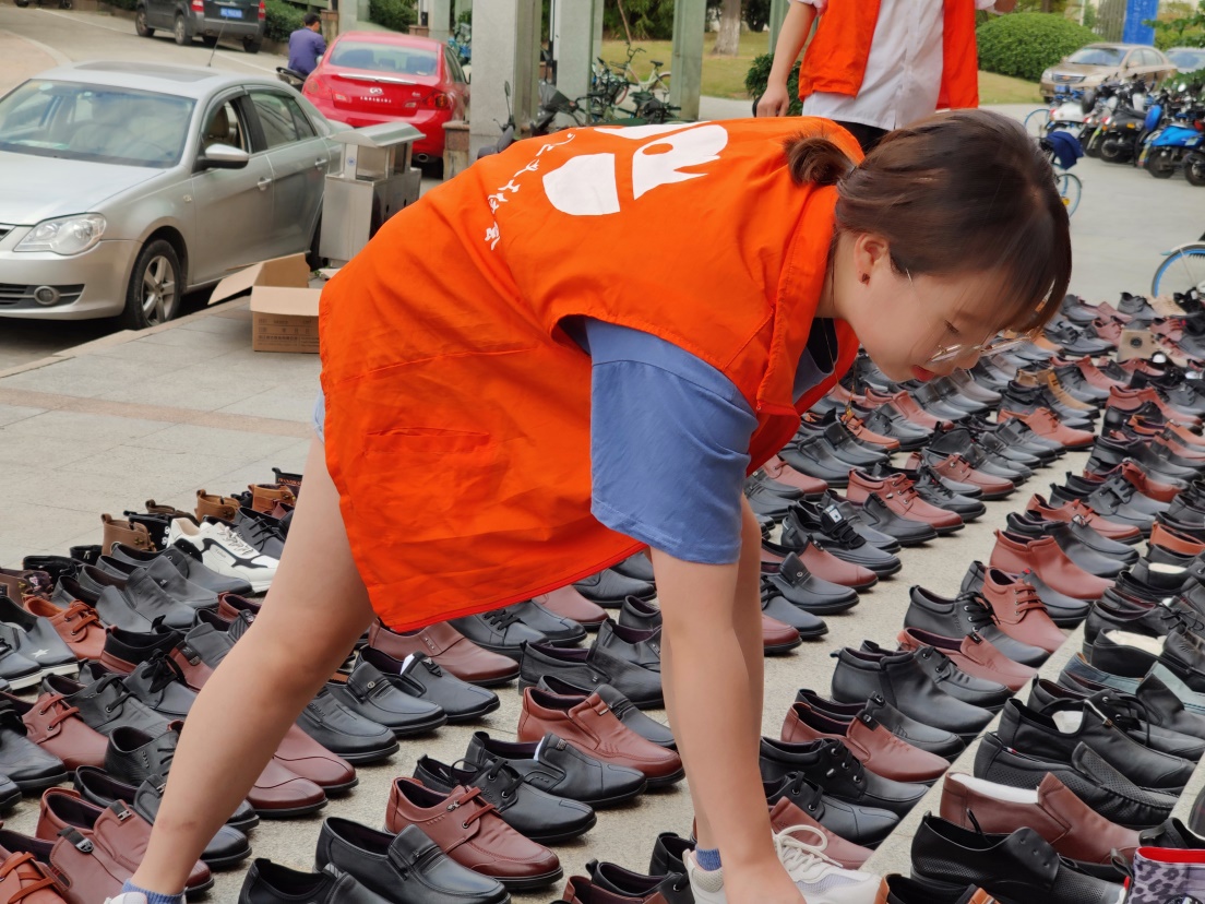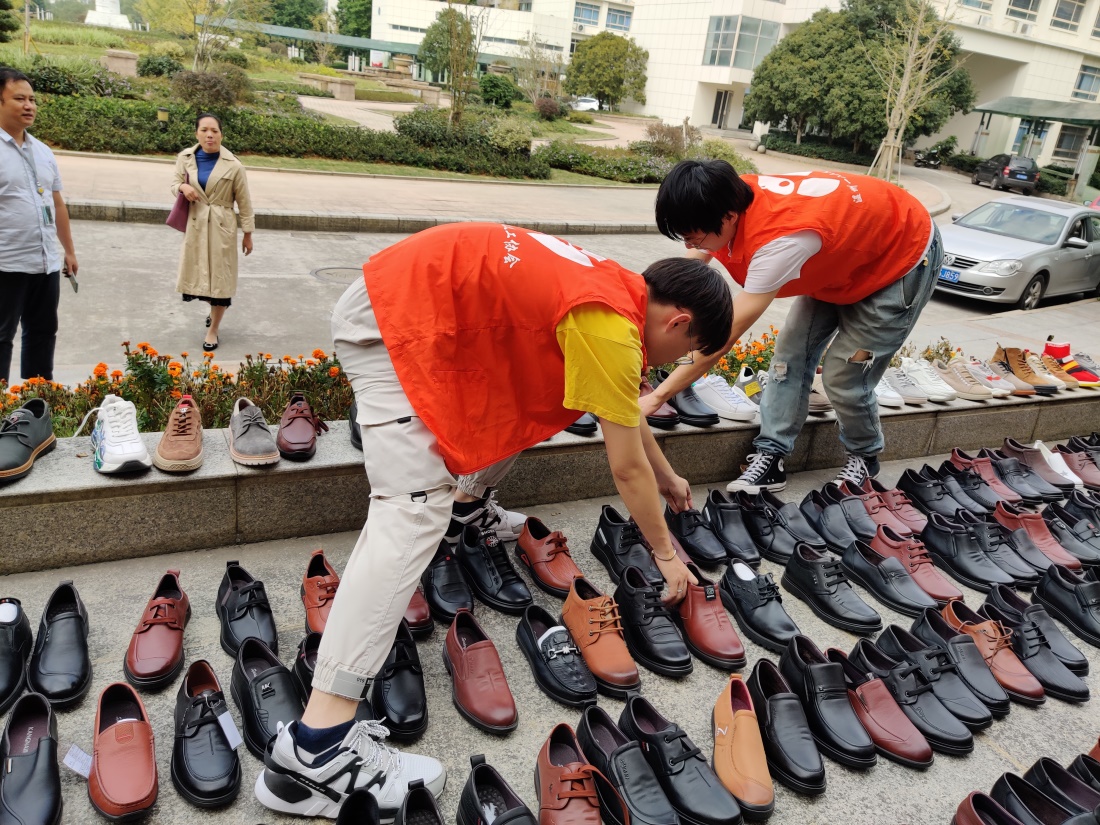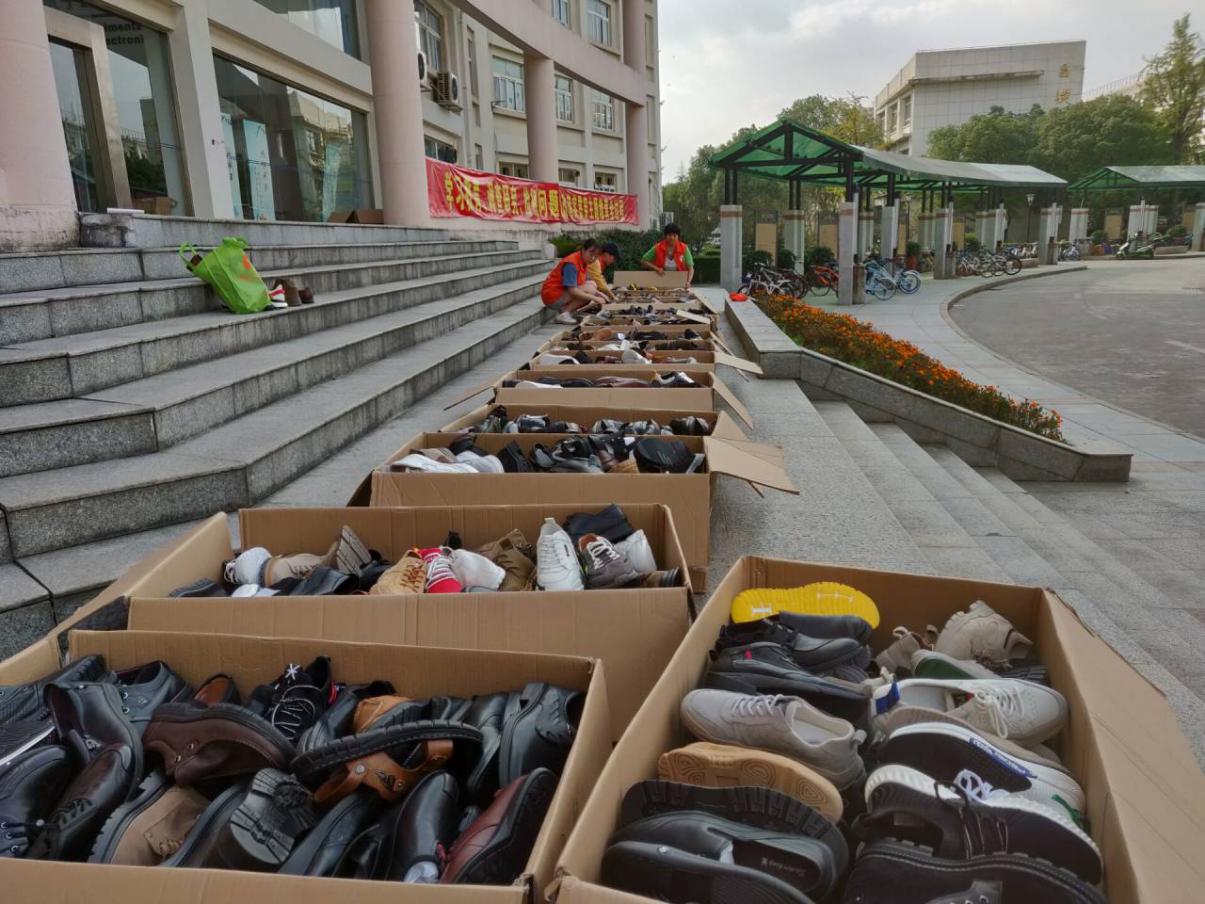 鞋子整理打包完毕运到球盟会官网时已经是十一点半。志愿者们依然兴奋不已,顾不上吃饭,立马开始工作,电气学院八级大台阶顿时成了天然的大鞋架。