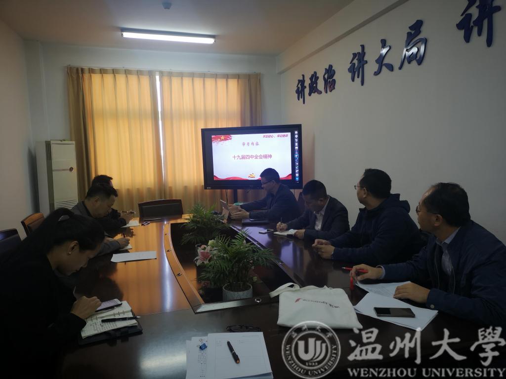 11月15日上午,公司党委理论中心组在1A594召开本学期第四次学习会,学院全体班子成员和党委委员参加了学习会议。学习会由公司党委书记李方强主持。本次学习会集中学习党的十九届四中全会精神。