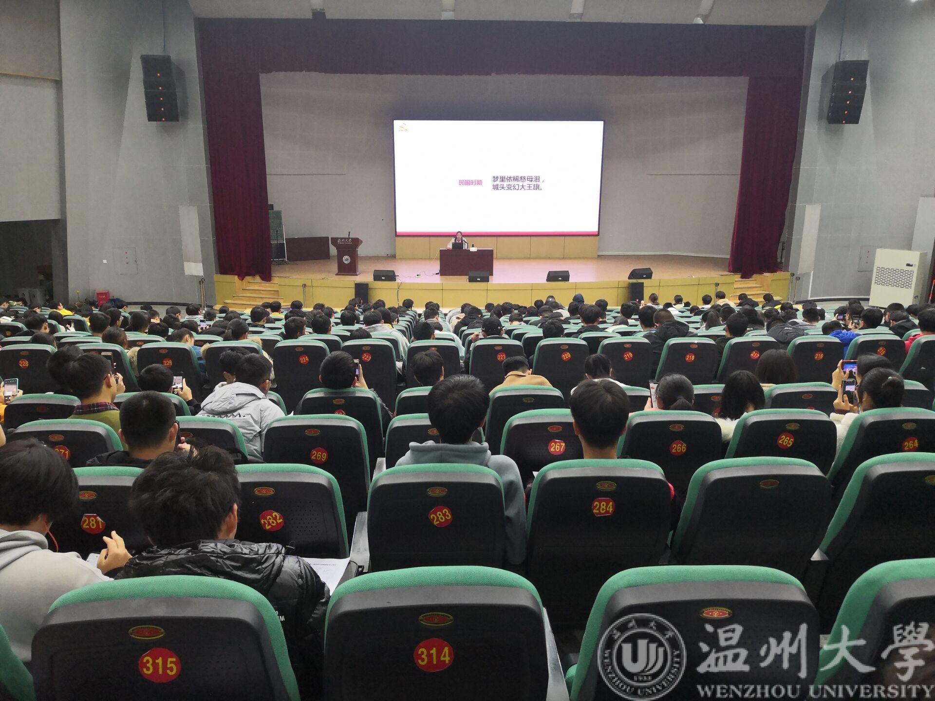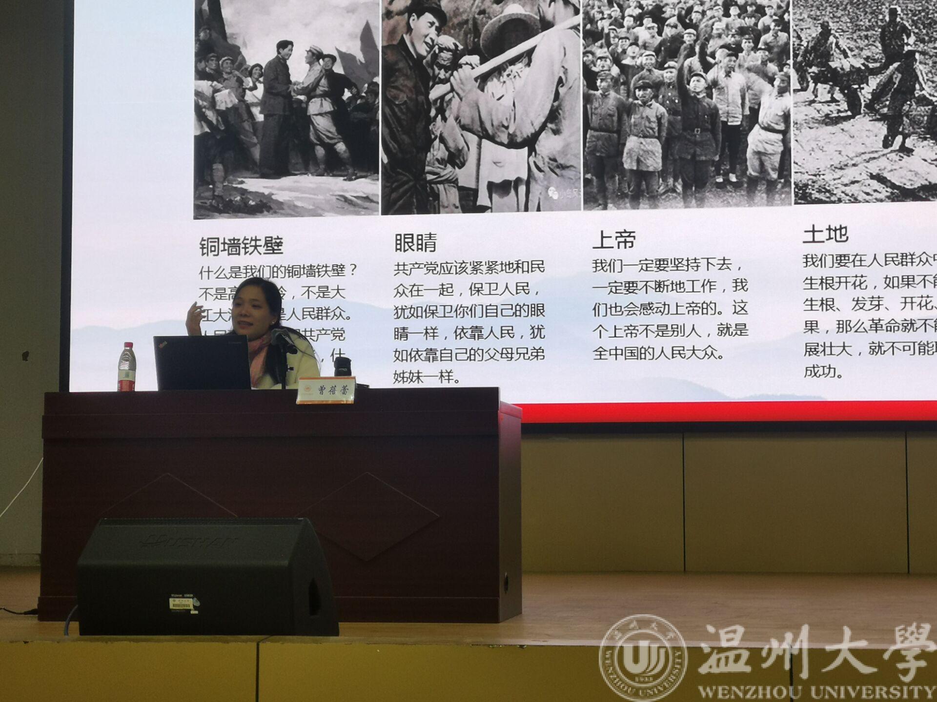晚上7点整,曾蓓蕾老师以"不忘初心,继续前进""不忘初心,牢记使命"的话题开始讲述,着力表现了中国共产党成立以来面临的艰辛。中国共产党在民族危难之际怀揣初心,肩负梦想而来,正是中国共产党初心不改,才筑起了坚不可摧的血肉长城,筑起了坚强不屈的名族脊梁。之后,曾蓓蕾老师讲到习近平书记在庆祝改革开放40周年大会上讲的中华民族实现伟大复兴的三个里程碑:中国共产党成立、中华人民共和国成立、推进改革开放和中国特色社会主义建设,这都是自改革开放以来中国发展的重大事件。讲座中途,曾蓓蕾老师以一首抒情的歌带动现场气氛,同学们回以热烈的掌声。在讲座的最后,曾蓓蕾老师给同学们留了一个思考题:"每一位普通老员工的初心和使命是什么?如何坚守?"希望同学们能够认真思考这个问题,并对同学们寄予了殷切厚望。