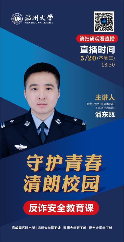 为做好反诈安全宣传教育,切实增强广大师生防范电信网络诈骗的意识,5月20日晚,学校举行了全校师生“同上一堂反诈安全教育课”的线上活动,本次线上活动以“守护青春 清朗校园”为主题,由瓯海公安分局高教园区派出所所长潘东瓯主讲,公司学子积极参与线上学习。