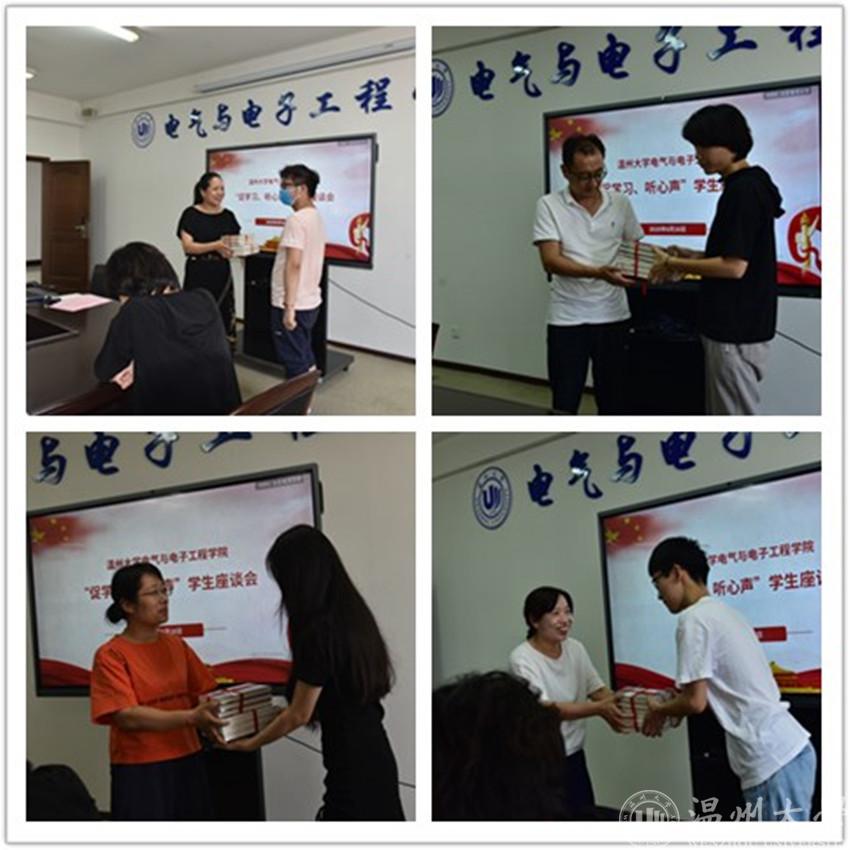 会议伊始,由教工支部组织委员潘龙飞逐一介绍与会各位党员和老师的基本情况。紧接着,参会的各年级员工代表逐一做自我介绍,并从疫情期间线上学习情况、返校之后的学习和生活状况、学分获得、重修课程等方面进行了自我反馈,参会的班干部代表还围绕着班级管理、学风建设、寝室生活等方面进行了面对面沟通和交流。会议过程中,公司党委书记李方强就员工有关学习、学分、就业等问题做了交流,他语重心长的指出,学院有十几位行政老师,我们的任务就是负责服务大家的学习和成长,各位同学们在学校里不仅要和班主任、代课老师做好交流和沟通,也要和学院教学口、学工口的老师多沟通,希望大家能在学校里在完成好学业的同时,也要学会成长、学会做人。会议第三项,举行赠书仪式。会前教工行政支部给员工们精心购买了励志书籍,赠予他们,以此鼓励他们积极进取,顽强拼搏。