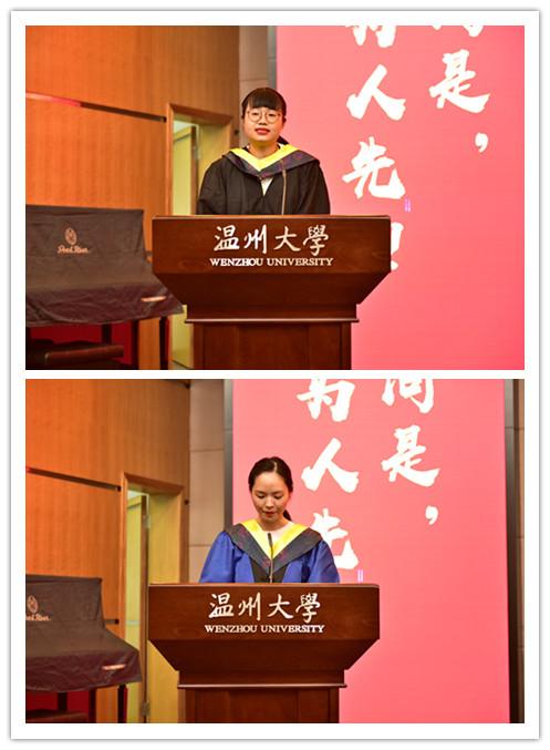 最后进行的是对省、校优秀毕业生的表彰,由副经理朱翔鸥宣读表彰名单,研究生张佳瑶、本科生俞珠颖分别作为研究生代表和本科生代表,依次上台发言。
