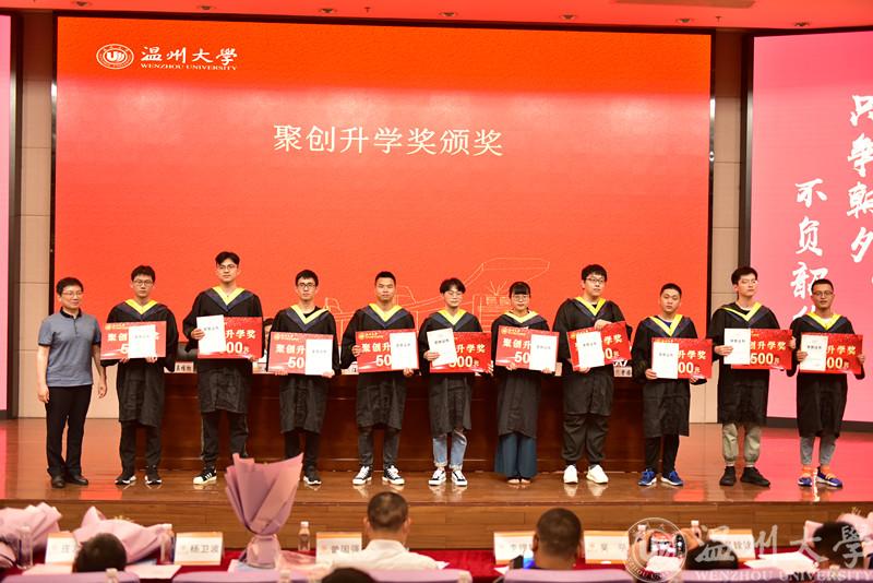 毕业典礼的第二环节,进入聚创升学奖颁奖仪式,由副经理陈孝敬宣读获奖名单,聚创公司董事长、学院资深教授吴桂初老师对获奖同学(共58人)一一进行颁奖。