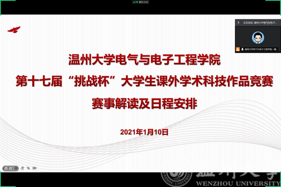为及时传达1月8日校团委召开的“第十七届‘挑战杯’老员工课外学术科技作品竞赛赛事动员大会”的会议精神,进一步提高公司师生参与大赛的热情,更好的为师生答疑解惑,1月10日晚18:30,公司召开“第十七届‘挑战杯’老员工课外学术科技作品竞赛赛事解读及日程安排”线上会议。学院经理汪鹏君、党委副书记曾蓓蕾,及预参赛项目的员工和部分指导老师参与了此次会议,会议由学院负责科创工作的辅导员潘龙飞主持。