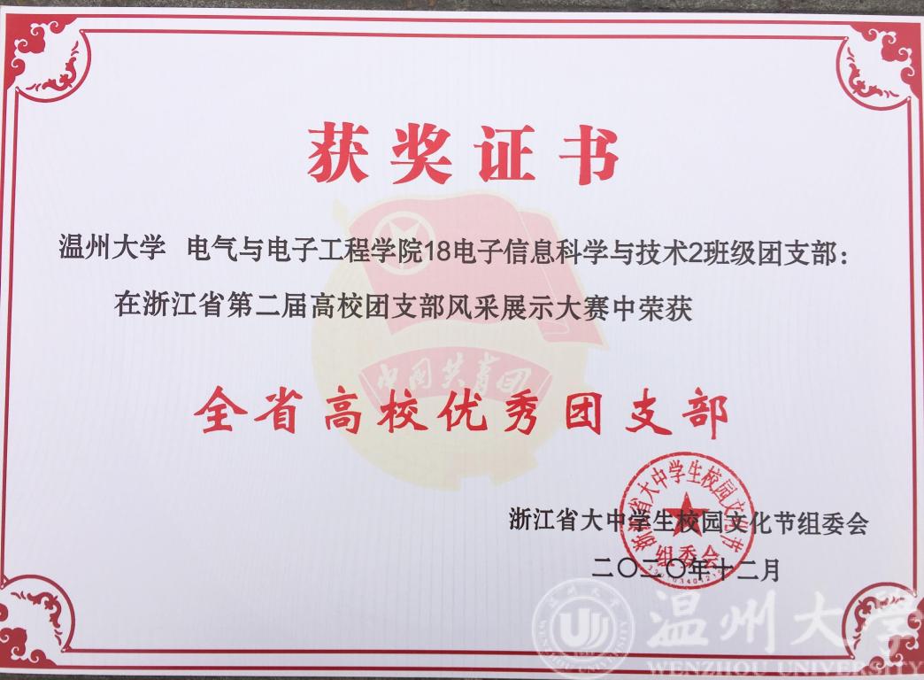 在刚刚结束的浙江省第二届高校团支部风采展示大赛中,公司18电科2班荣获“全省高校优秀团支部”荣誉称号。