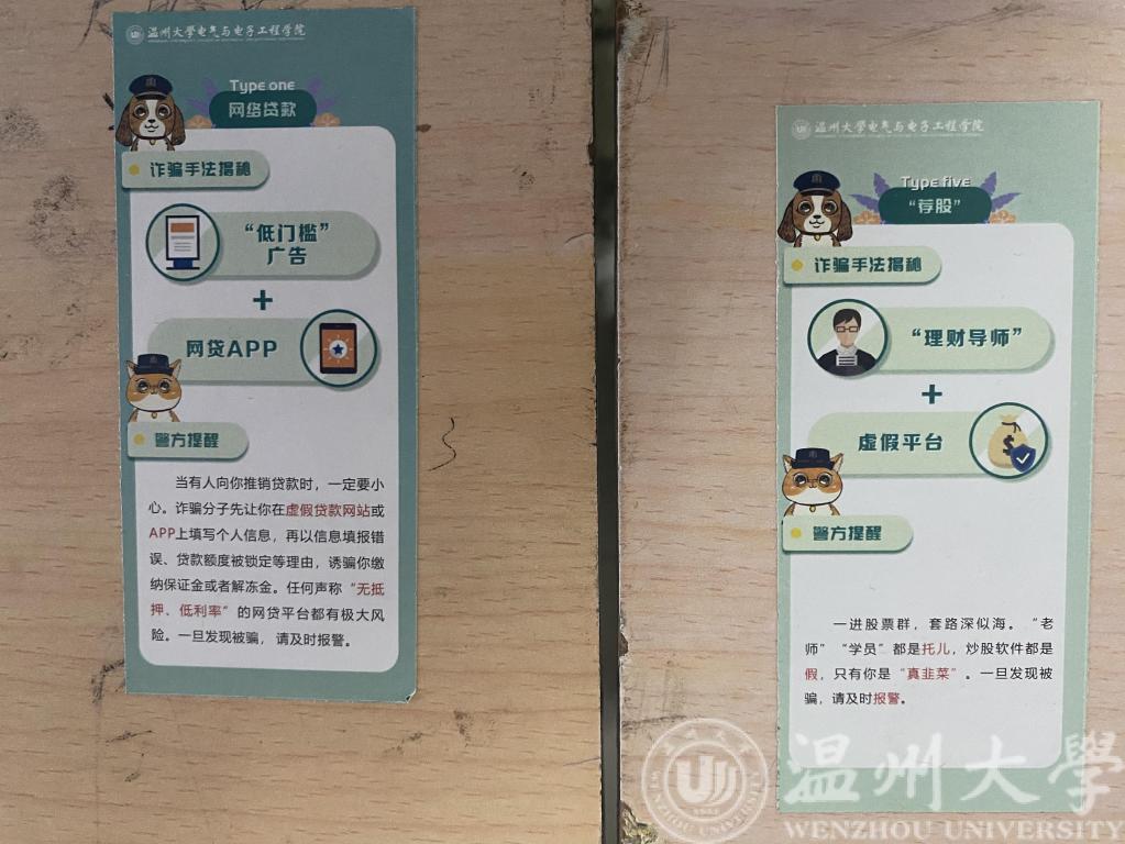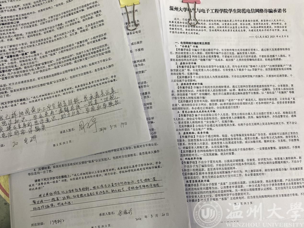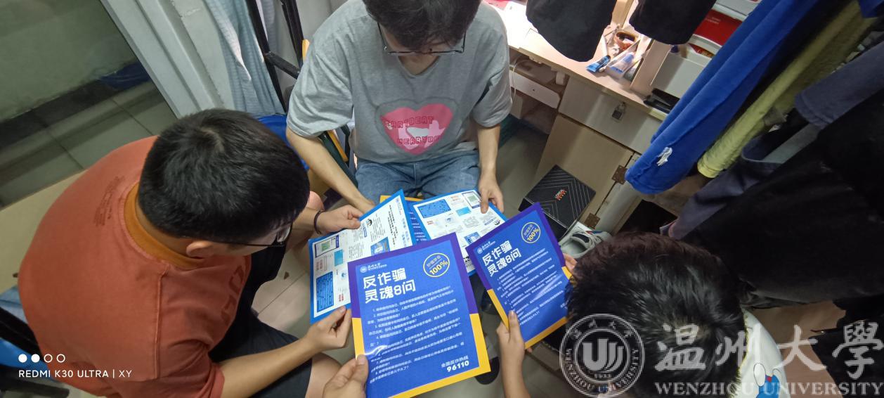 5月以来,学院开展“防诈安全宣传月”活动:以学院为单位在教室及学院公共区域粘贴防诈小贴士;以班级为单位召开主题班会;以宿舍为单位集体学习防诈宣传单;以个人为单位签署防诈承诺书等。自活动开展以来,学院学工办各辅导员充分抓住各个机会对员工进行防诈安全教育:深入疫苗接种现场进行防诈APP推广、通过班主任会议详细进行“验证”小程序教学、利用员工干部抓手强化反诈骗意识宣传。
