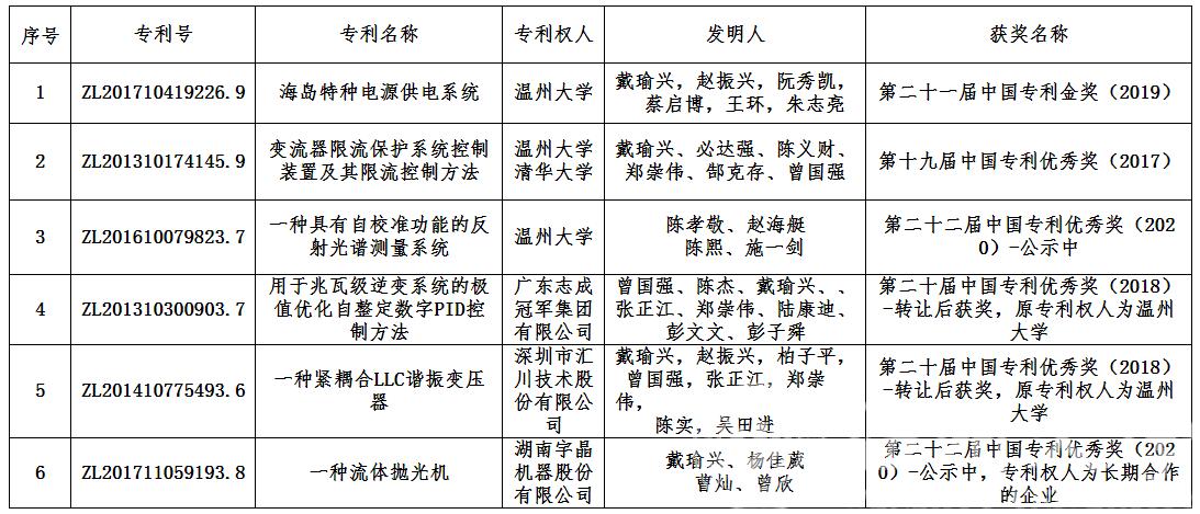 近年来,公司高度重视知识产权工作和科技成果转化工作,建立较完善的知识产权管理体系和相关科研激励政策,培育了一批高质量、高价值、具有完全知识产权的发明专利。球盟会专利成果培育及科研成果转化工作尤其卓有成效。截止2021年5月,球盟会教师以第一发明人获中国专利奖共6项。其中,以公司教师为第一发明人、球盟会官网为专利权人的发明专利获专利奖3项,包括中国专利金奖1项、优秀奖2项(公示中1项);发明专利转让合作企业、以及合作企业联合开发产品申报发明专利后,获中国专利优秀奖3项。尤其是以戴瑜兴教授为第一发明人、球盟会官网为专利权人的《海岛特种电源供电系统》获第二十一届中国专利金奖(2019年度),是温州市自中国专利奖设立以来首次获得该奖项,高校获得此殊荣的全国仅64项。