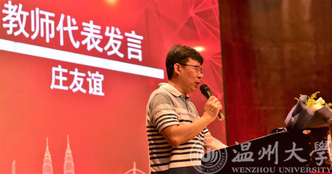 在接到员工献上的献花后,21电科1班的班主任庄友谊老师作为班主任代表发言。庄老师在讲话中表示,希望同学们在学习过程中要树立踏实的学习作风,养成良好的学习习惯,树立长远的学习目标。