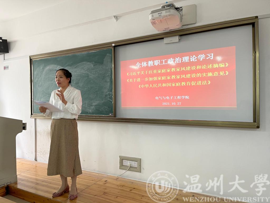 会议伊始,公司党委副书记曾蓓蕾带领全体教师学习了文件《习近平关于注重家庭家教家风建设和论述摘编》《关于进一步加强家庭家教家风建设的实施意见》《中华人民共和国家庭教育促进法》,提出家庭是社会的基本细胞,家庭建设是社会进步和国家发展的重要基础,家风建设是完善国家治理的重要依托。接着公司党委书记李方强为全体教工补充学习了黄大年事迹和浙江省委、温州市委相关会议精神。