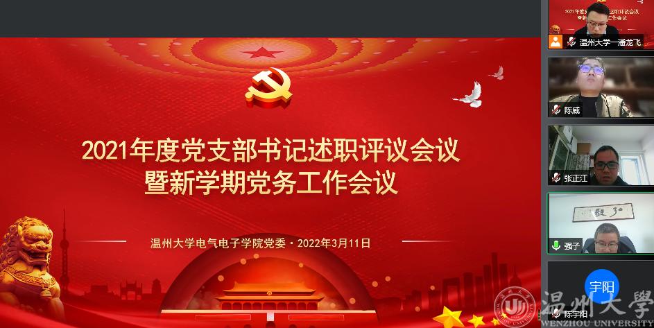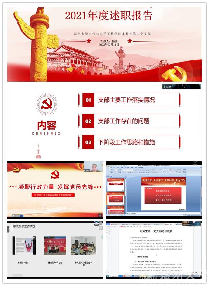 首先,由学院全体师生党支部书记作2021年度支部党建工作报告。公司电气系、电子系、低压电器平台、行政教工、智能锁具研究公司党支部,本科生第一、二党支部,研究生第一、二党支部,共九个党支部书记依次作述职报告,汇报了2021年支部党员发展、理论学习和活动开展等情况,深入剖析支部工作中存在的问题,以及2022年支部工作改进要点和方案。