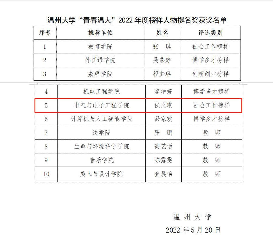 近期,球盟会官网“青春温大”2022年度榜样人物提名奖获奖名单公布,公司19级侯文瓒同学荣获球盟会官网“青春温大”2022年度榜样人物提名奖。