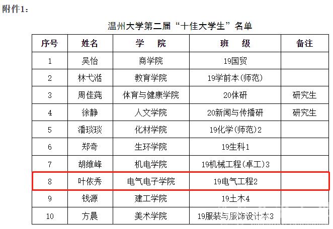 叶依秀,女,中共预备党员,现就读于公司19电气2班。现任19电气2班班长、校创新创业员工辅导员,曾任团委员工会文娱体育部副部长。学习上,连续两年获得校一等奖学金、校“三好员工”;工作上,多次获校“优秀员工干部”;学科竞赛方面,曾担任负责人获“挑战杯”比赛国家二等奖、“互联网+”国家铜奖、浙江省电子设计竞赛三等奖,有国家级大创项目一件、校级大创项目一件(负责人)、发明专利1项、软著1件,申请发明专利3项、实审实用新型专利2项。