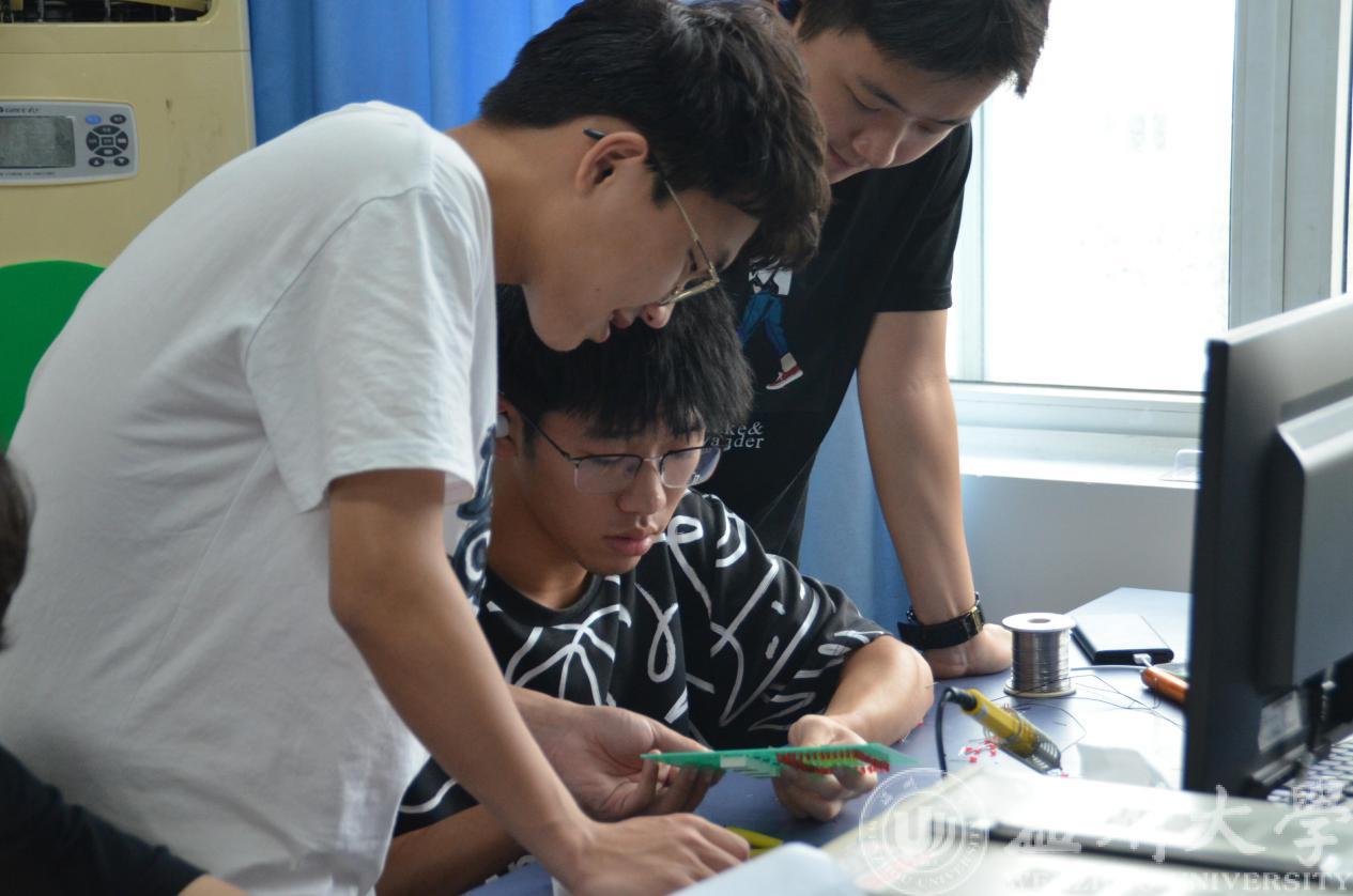 同学们从早上八点开始就专注于设计与建团一百周年主题相关的电路图。在此期间,有许多优秀的设计思路以及新奇的想法诞生。随后,同学们各显身手,逐个排除自己电路图的设计缺陷然后进入焊电路阶段。同学们对自己团队遇到的问题进行激烈地讨论,最后一一解决,一切都进行地井然有序。