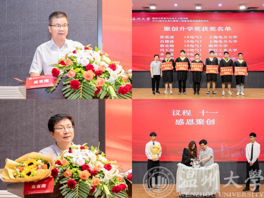 为表彰先进,在员工企业浙江聚创公司的赞助下,学院特别设立聚创奖学金。毕业典礼仪式上,公司党委书记李方强宣读了《2022年学院聚创奖学金奖励决定》文件及名单。聚创奖学金发起人吴桂初教授为获得聚创升学奖的31位同学颁奖。随后,毕业生代表任奕沛同学为吴桂初教授献花并表达感谢。