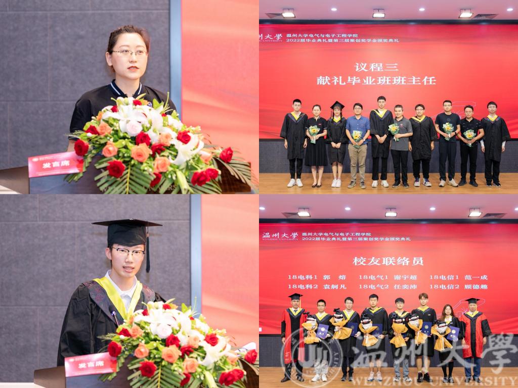 随后,各毕业班员工代表手捧鲜花,献给辛勤付出的班主任老师。音乐响起,员工代表们向班主任老师行谢师礼,老师和员工紧紧相拥将典礼推向高潮。感恩献花仪式后,18电科2班班主任杨硕老师和18电科2班袁舸凡同学分别作为师生代表上台发言。典礼上还为省校优同学颁发了荣誉证书,为各位员工联络员颁发了聘书。期间还观看了由学院领导、2022届毕业班班主任、学弟学妹们为2022届毕业生录制的祝福视频。一幕幕难忘的场景,一句句温情的话语,都将毕业生们的回忆紧紧串连在一起,在他们的心头久久萦绕。