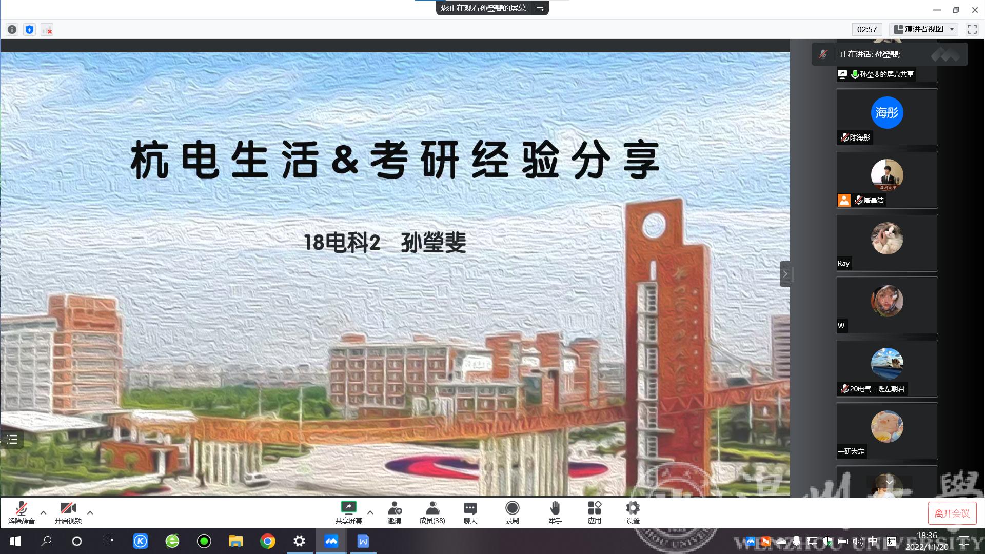 首先由2022届员工电科专业孙瑩斐分享她的考研经验。孙瑩斐和学弟学妹们分享了自己的研究生生活,随后对杭电目前招考、备考科目以及往年录取情况进行介绍。并在院校选择、书目推荐、专业课学习方法等方面都提出很多好的建议。孙瑩斐指出要坚定自己考研的想法,清晰自己考研的目的和方向,不要受其他外界因素干扰。