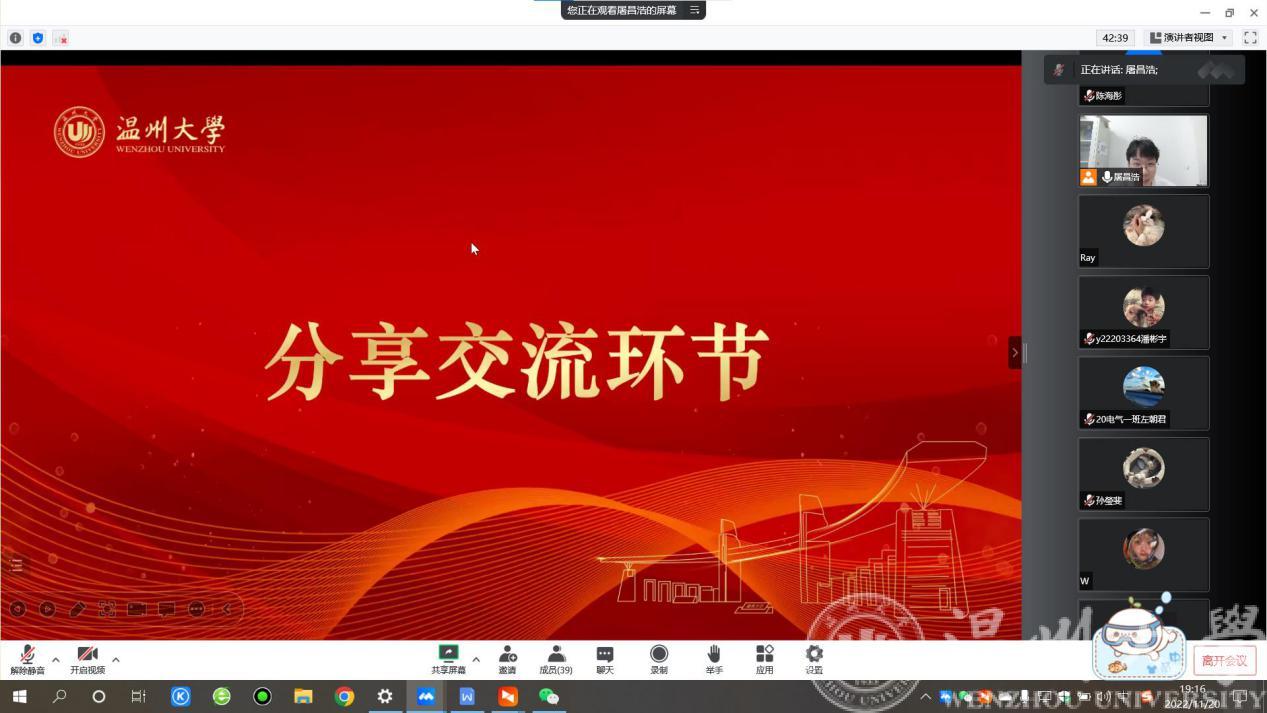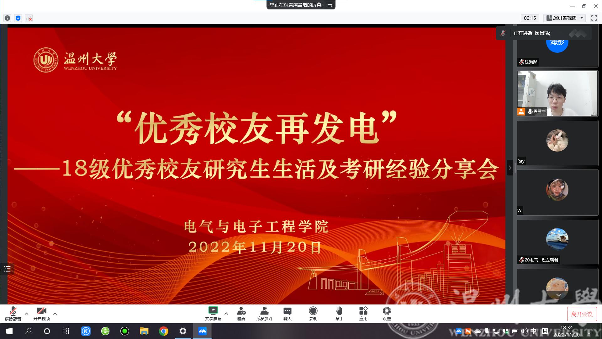 为进一步营造提高公司员工考研热情,营造良好考研氛围,同时增强员工与母校交流合作,发挥员工榜样力量。学院于11月20日晚召开组织召开线上18级优秀员工考研经验分享会。本次分享会邀请到2022届优秀毕业生孙瑩斐(目前就读于杭州电子科技大学,电子科学与技术专业)、潘彬宇(目前就读于上海电力大学,电气工程专业)为学弟学妹们们分享考研经验和研究生生活。出席本次会议的有院负责员工工作的辅导员屠昌浩老师、负责考研工作的辅导员陈海彤老师,即将参加2023年考研的员工及其他年级有意向考研同学。