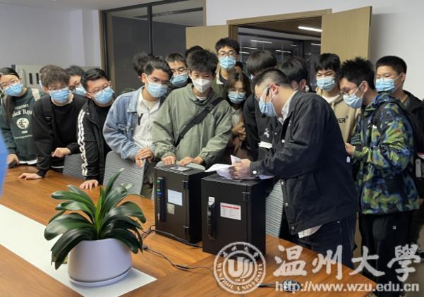 电科专业员工还参观了一卡锁具有限公司,受到人事部陈经理、董经理等人的热情接待。在相关人员的带领下,员工们参观了锁具制造车间、智能锁展示厅、研发部门,并在报告厅聆听了公司基本情况、发展历程、公司理念等,对上下游产业和未来发展方向进行了深入了解。同时,公司安排毕业于温大的员工(如18级电科童剑涛学长)为同学们分享了职场经验。随后,同学们与公司经理和学长进行了热烈的讨论和交流。