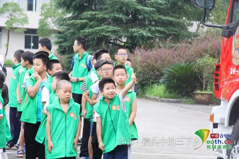 小朋友们在实践队员们的带领下参观当地消防站并进行消防知识学习。 中国青年网通讯员 黄浚辰 摄