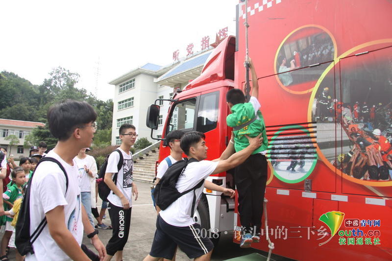 小朋友们在消防站的消防车上进行跳楼演练,实践队员们全程在旁保护。 中国青年网通讯员 黄浚辰 摄