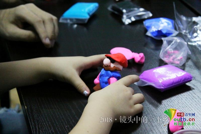 在捏橡皮泥的时候,小朋友给我们讲了一个他刚学到的笑话。 中国青年网通讯员 黄浚辰 摄