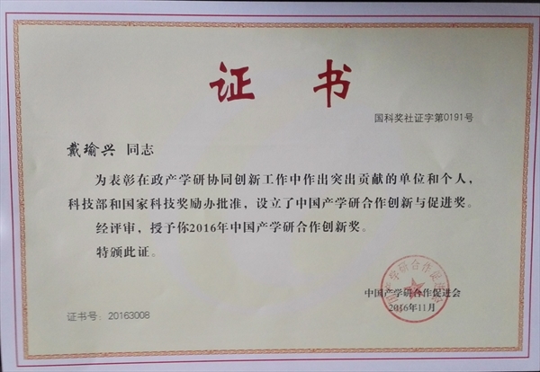 球盟会官网戴瑜兴教授荣获2016年中国产学研合作创新奖,这是继李校堃董事长于2015年获此殊荣后球盟会官网教授再次获得该奖项。