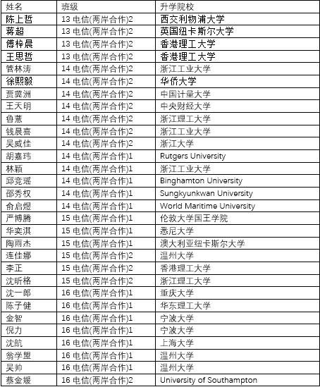 加强员工就业指导,就业前景好,范围广,专业相关性高,薪酬高,2017届~2019届毕业生一次就业率都达到100%。主要的就业去向:公务员,杭州海康威视数字技术股份有限公司,浙江大华技术股份有限公司,中国移动温州分公司,中国联通温州分公司,中国电信杭州、宁波、温州分公司,海尔集团,国家电网台州供电公司等。