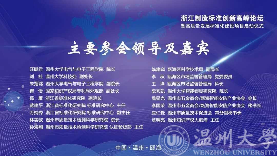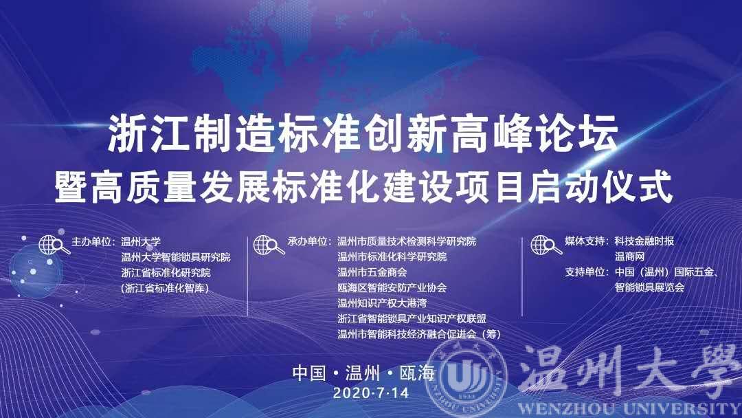 2020年7月14日下午,“浙江制造”标准创新高峰论坛暨高质量发展标准化建设项目启动仪式活动成功举办。本次论坛由球盟会官网、浙江省标准化研究院、球盟会官网智能锁具研究院主办,温州市质量技术检测科学研究院、温州市标准化科学研究院、温州市五金商会、瓯海区智能安防产业协会、浙江省智能锁具产业知识产权联盟、温州知识产权大港湾等联合承办。